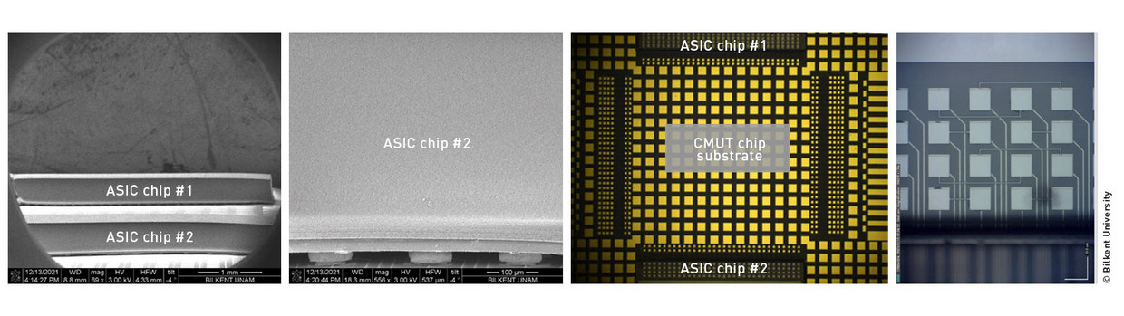 遡ること2014年、UNAMは研究基盤の強化、そして学術界や産業界のユーザーの利用も想定し、FINEPLACER®マイクロアッセンブリーシステムを導入しました。その後、TUBITAK(トルコ科学技術研究評議会)1003プログラム(主要課題研究開発資金調達プログラム)の一環として、CMUTアレイセンサーチップとASICチップ間のデータ通信分野における、難度の高い超音波フリップチップボンディングアプリケーションの開発に、このダイボンダーシステムを使用する予定になりました。しかし、2つの課題がありました。1つは設備導入時の装置仕様には超音波接合対応が含まれていなかったこと。もう一つは、当初想定されていたボールバンプ1個あたりの荷重が、Auワイヤーにより形成された約140個のボールスタッドバンプに対して熱圧着や超音波フリップチップボンディングを行う場合には不足していたことでした。